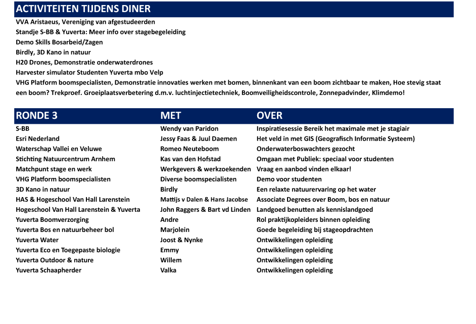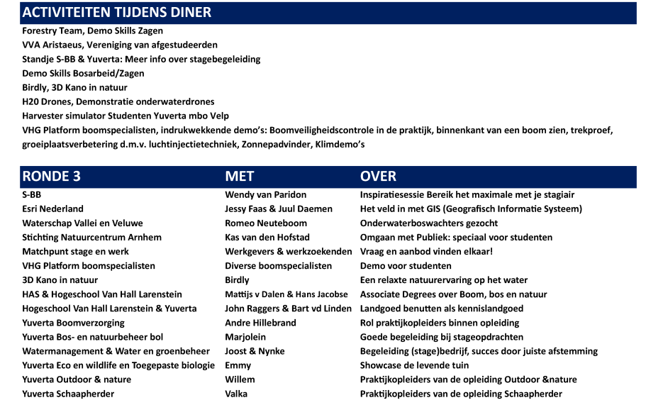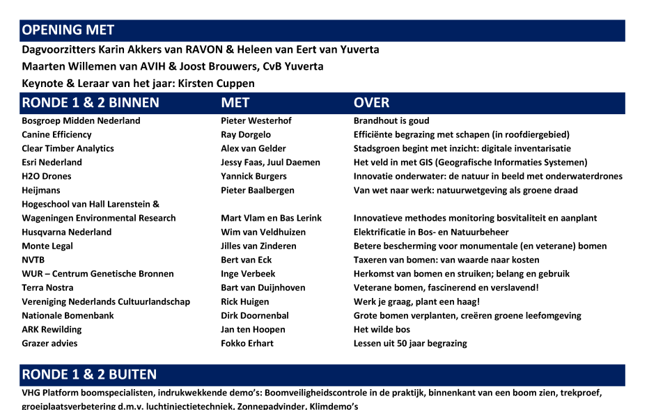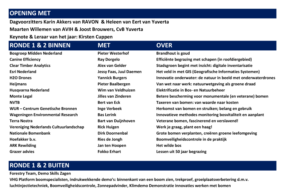 Een middag en avond vol interactieve workshops, debatten en lezingen. Je kijkt verder dan je eigen vakgebied en ontdekt kansen in boomspecialisme, bosbeheer, natuurbeheer, ecologie en onderwijs. Ontmoet vakgenoten, wissel kennis uit en laat je verrassen door de verbinding tussen disciplines.